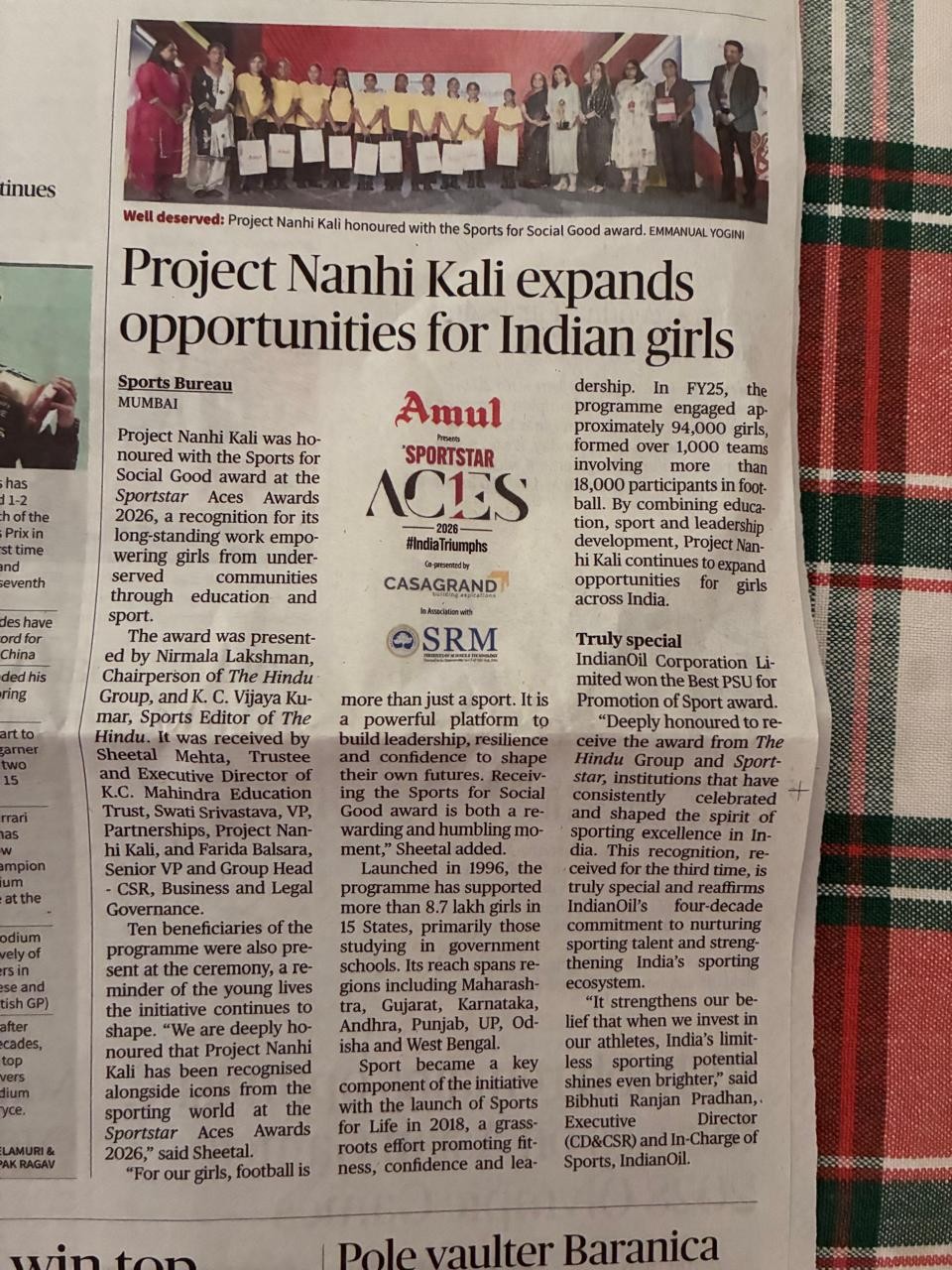 Expressing gratitude on the occasion, Sheetal Mehta, the spokesperson for Project Nanhi Kali said: “We are deeply honoured that Project Nanhi Kali has been recognised alongside icons from the sporting world at the Sportstar Aces Awards 2026. For our girls, football is more than just a sport, it is a powerful platform to build leadership, resilience and confidence, enabling them to shape their own futures. Receiving the Sports for Social Good award is both a rewarding and humbling moment.”